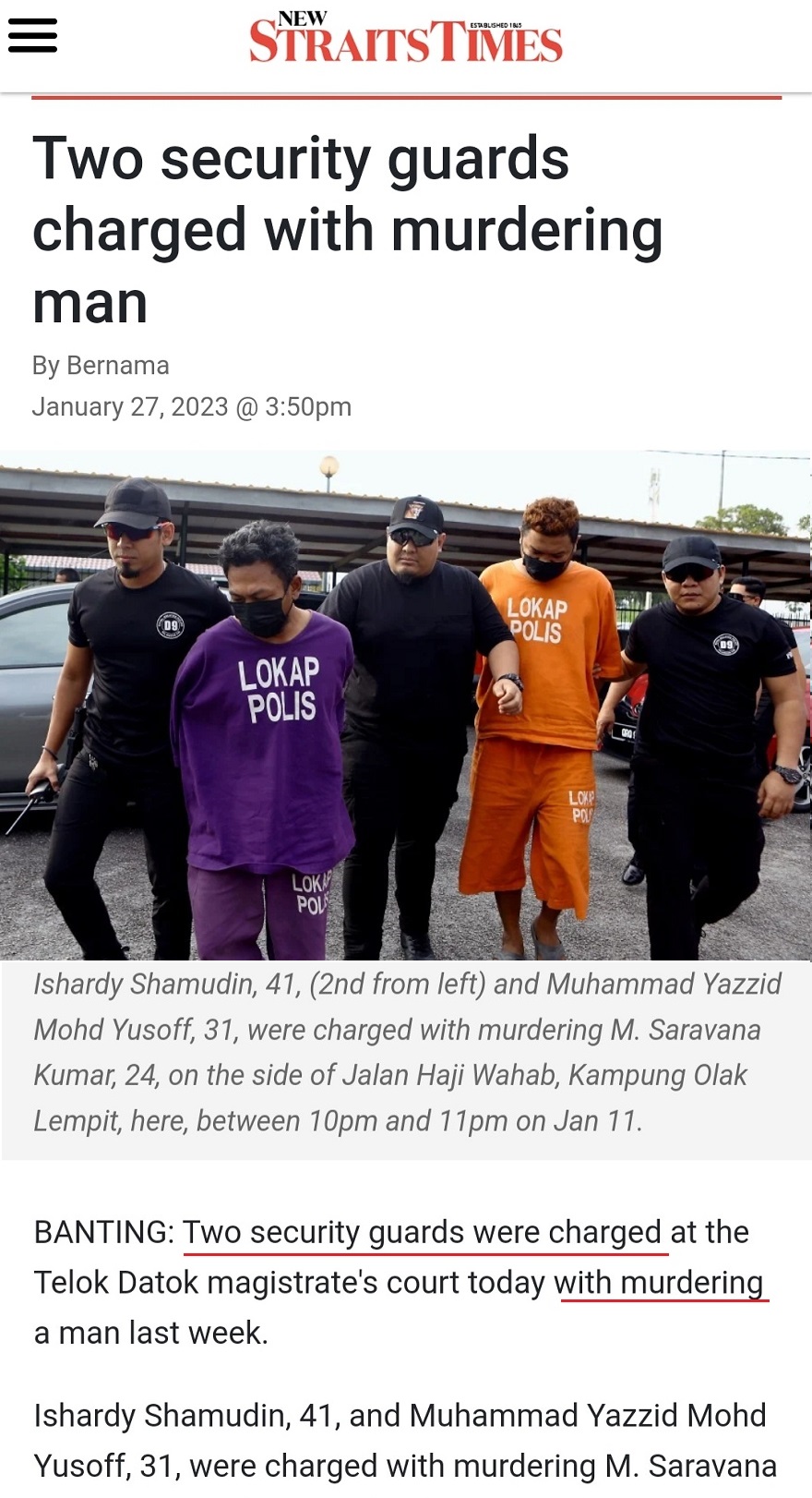 On Aug 4, two guards at a chicken processing factory, Wan Amir Hamzah Abu Hassan, 48, and Syed Mohd Fazrul Syed Mohd Ridhwan, 23, were found dead with slash marks on their body.